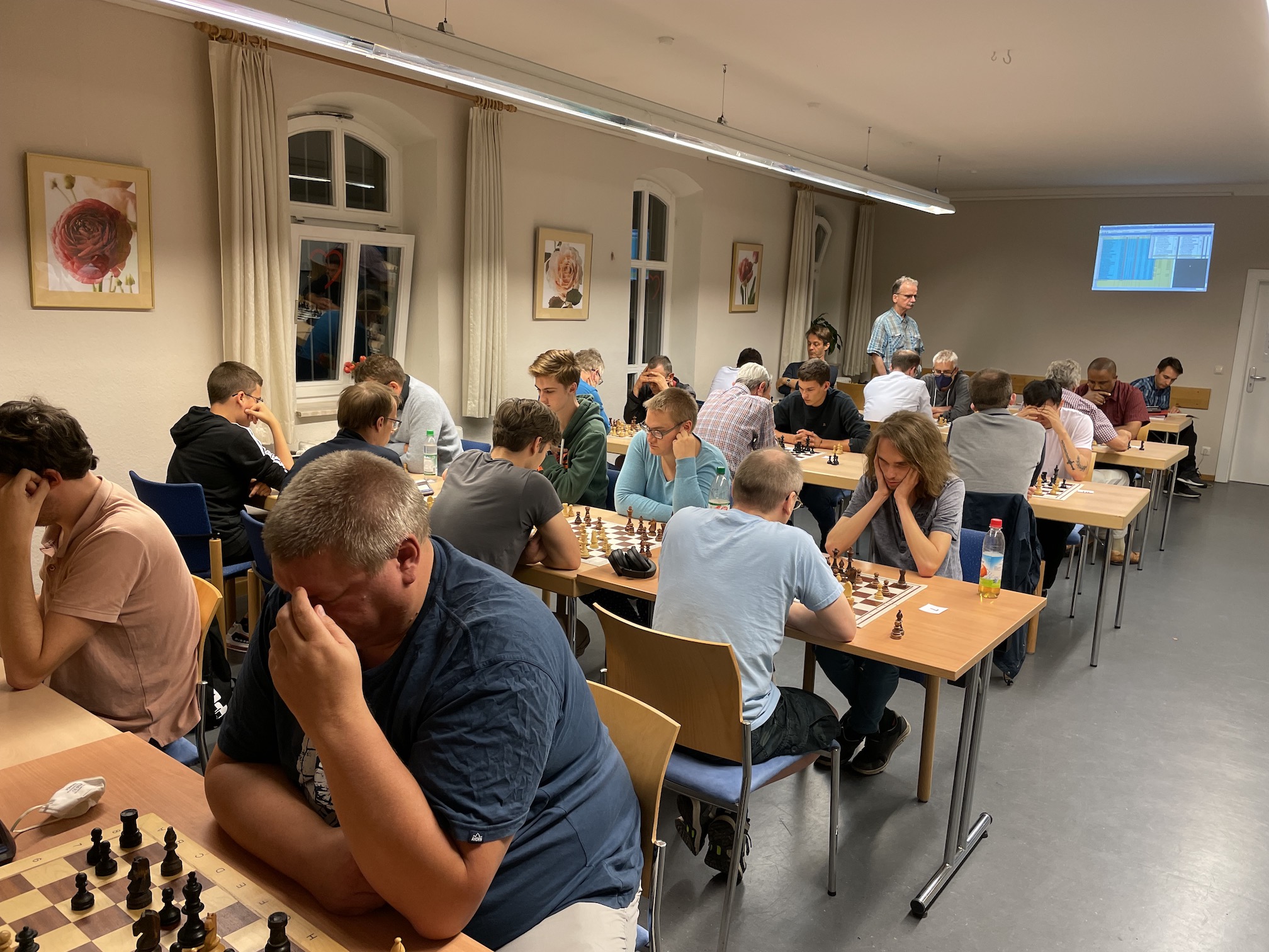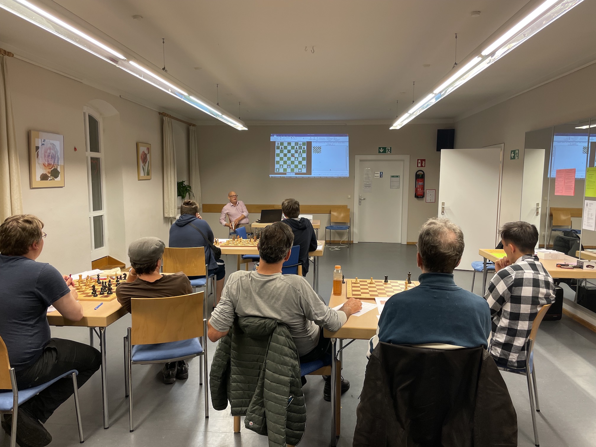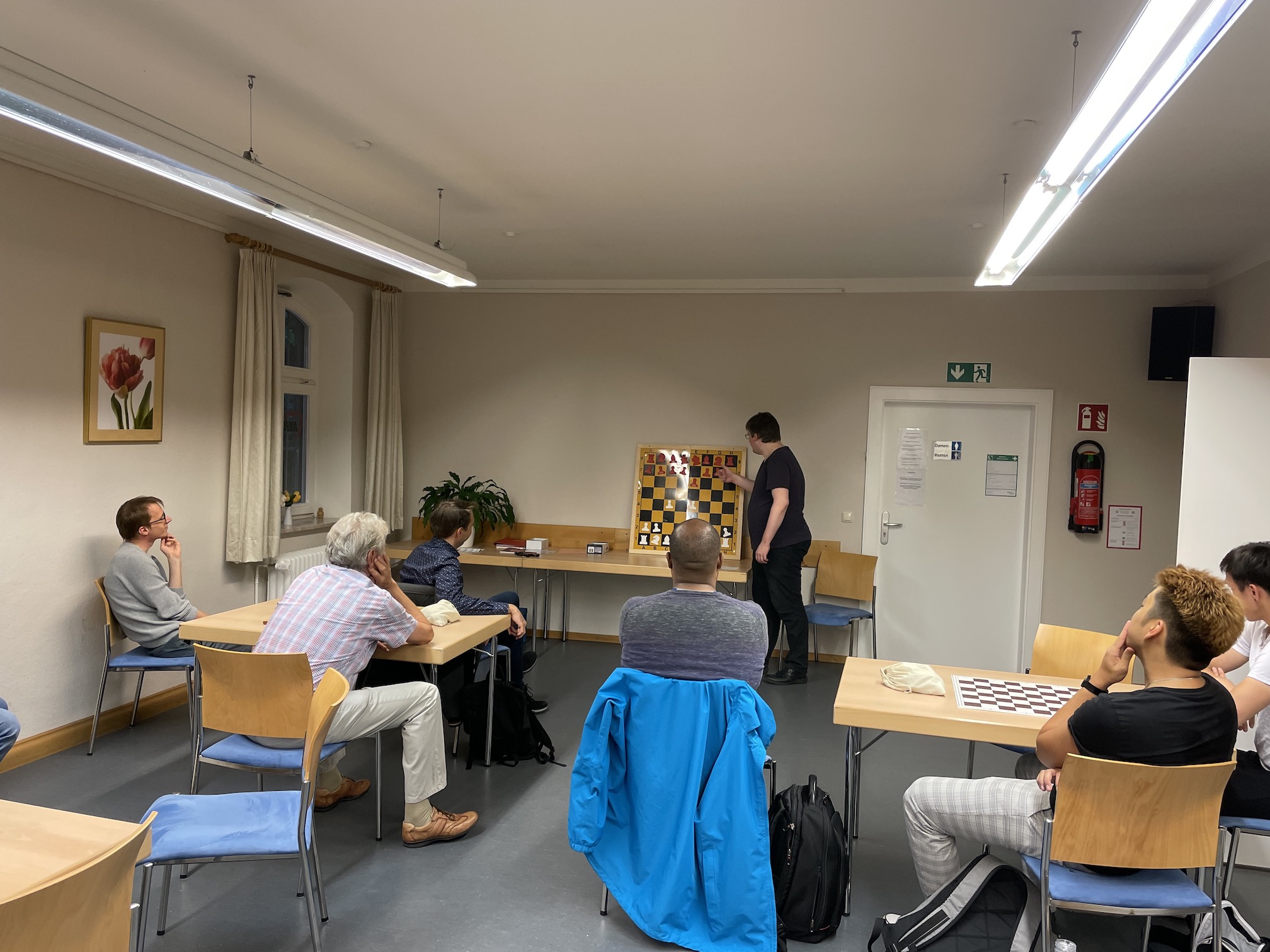 Mehr als 20 Spielerinnen und Spieler waren neugierig, Simon Ritzka am vergangenen Mittwoch bei der Kommentierung einiger seiner Partien aus der Bayerischen Schachmeisterschaft zuzuhören und zu sehen, darunter auch etliche interssierte Gäste, die vielleicht Geschmack auf mehr Vereinabende bekommen haben. Auch Gelegenheit zum freien Spielen war geboten.