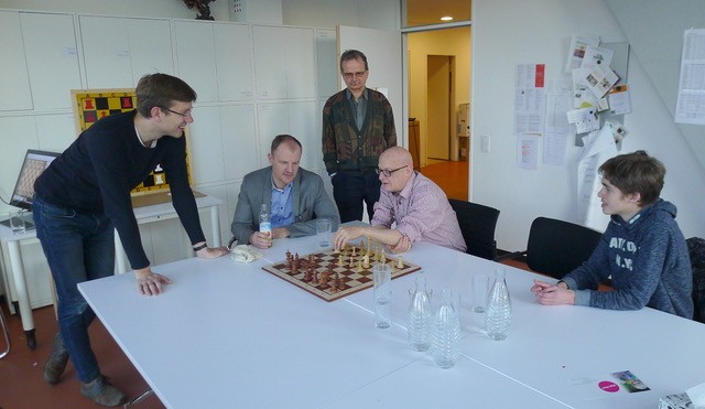 … gab es am Mittwoch, 17. April, in den Spielräumen unserer 1. Mannschaft, nachdem das angekündigte Thema „Initiative entfalten” an Hand von Partien Sylvio Joschs, unserem Brett 1, zu wenige nach Laim gelockt hat. Statt dessen zeigte Stefan Krämer, wie er bei einer Offenen Intern. Bayer. Meisterschaft in Bad Wiessee den späteren Großmeister David Baramidze positionell überspielt und warum er das Turmendspiel dann doch nicht gewonnen hat. Christian Parschs Sieg über Dimitrios Andronoudis aus der letzten Runde der Vereinsmeisterschaft wurde von den Spielern der 1. Mannschaft einer kritischen Würdigung unterzogen.