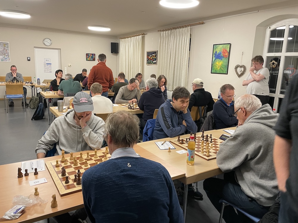 Als erster war Klaus fertig. Im Wolga-Gambit kannte er sich besser aus als sein Kontrahent, der angesichts seines Mehrbauern mutwillig Figurenabtausch forcierte und sich wohl nicht darüber im Klaren war, dass gerade der Abtausch von Dame und Springer in diesem System nur Schwarz zugute kommt. So kam es, wie es kommen musste, und Klaus konnte durch eine typische kleine Kombination entscheidendes Material und in der Folge die Partie gewinnen. Auch an den anderen Brettern schien nichts anzubrennen, so dass Paul mit Remis zufrieden war. Dann aber verlor Frank in total gewonnener Stellung seine Partie durch ein Handyklingeln, und Burak musste sich am Spitzenbrett der Überlegenheit des alten Haudegen Günter Schütz beugen, sodass aus einer Führung ein knapper Rückstand geworden war.