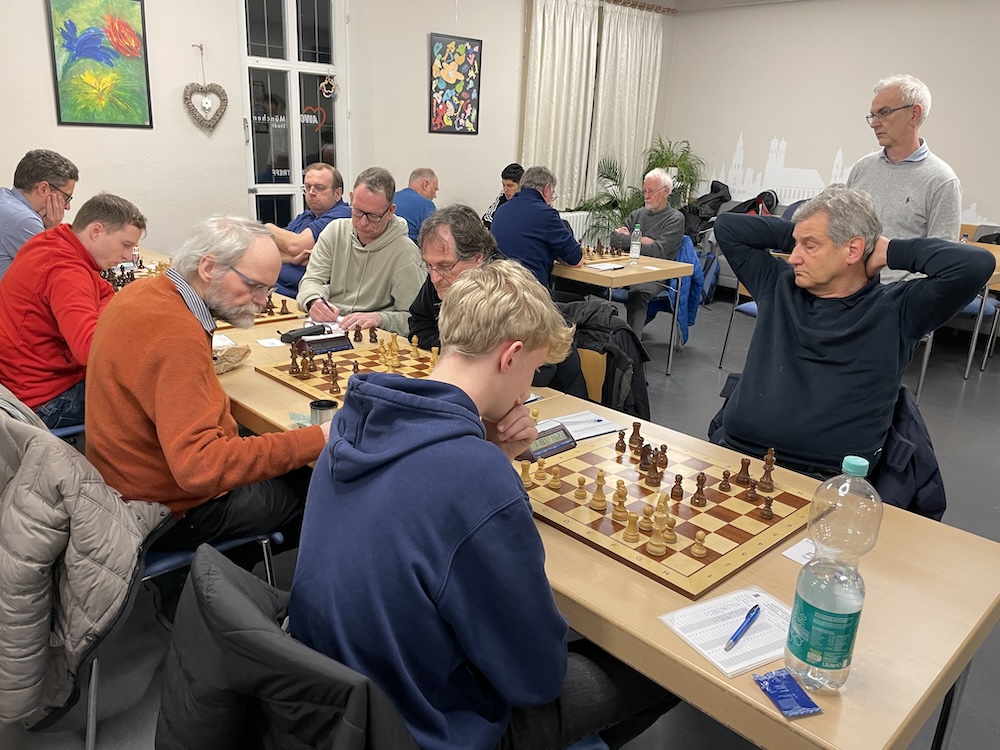 Pauls Gegner war nicht erschienen, so stand es bald 1:0 zu unseren Gunsten. Wolfgang musste sich seinen Sieg dagegen hart erarbeiten. Nachdem Werner der DWZ-Überlegenheit seines Gegners erst nach einem eigenen Flüchtigkeitsfehler Tribut zollen musste, konnte Klaus bei beginnender Zeitnot seines Gegners dessen Flüchtigkeitsfehler ausnutzen und den alten 2-Punkte-Vorsprung wiederherstellen. Oliver konnte ein schwieriges Turmendspiel nach Turmverdopplung auf der 2. Reihe trotz Bauernminus problemlos zum Remis führen. David hatte das Pech, gegen den nominell stärksten Spieler im Saal antreten zu müssen und war letztlich chancenlos, wonach wir "nur noch" 3,5:2,5 führten. Die beiden verbliebenen Partien standen zu diesem Zeitpunkt aber ebenfalls bereits besser für uns. Tatsächlich konnte Jakob sein Bauernplus in einem Endspiel mit Damen kontinuierlich ausbauen und durch das zwanghafte Bemühen seines Gegners, Abtausch zu vermeiden, sogar frühzeitig Matt setzen. Dagegen konnte Agim seine Mehrqualität nicht zum Sieg verwerten und musste mit Remis zufrieden sein.